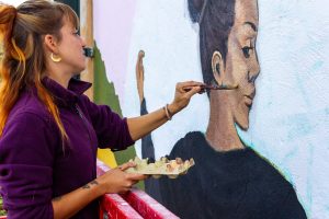 Por otro lado, Sojo, nos habla en su mural de la infancia como una etapa fundamental de la vida, cargada de aprendizajes y descubrimientos. Muestra una escena que enfatiza la importancia de la enseñanza y la transmisión de conocimientos a generaciones de niños y niñas de la comunidad.