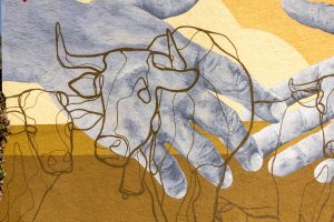 Continuamos nuestro recorrido hasta La Serna del Monte. En la pintura mural realizada por Caín Ferreras pueden verse dos manos que se estrechan. Este gesto representa el acto de cerrar un trato y hace alusión al origen del pueblo ya que fue un punto importante donde tenía lugar la compraventa de ganado. Así, el artista refleja la importancia del valor del gesto como lenguaje y nos invita a una reflexión sobre su preservación.