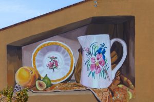 Terminamos la ruta en el pueblo de El Atazar. En este caso, la artista ha realizado una pintura mural en la que representa una escena costumbrista. En este bodegón, podemos ver reflejadas la riqueza de la tierra, su fertilidad para hacer crecer diversas frutas sin dificultad, como el melocotón o el higo, que la artista representa junto a elementos y objetos que los propios vecinos han prestado para esta composición.
