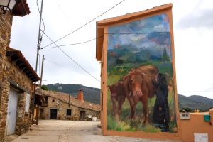 Seguimos hasta Gascones, donde el artista ha querido visibilizar “la fuerza y resistencia de las mujeres rurales, históricamente invisibilizadas, pero que son guardianas de tradiciones y saberes ancestrales”. En esta pintura podemos ver a una mujer cargando unos cencerros que sostiene con las manos pegadas al cuerpo.