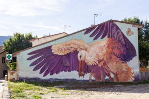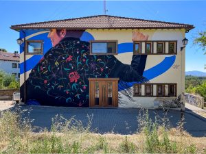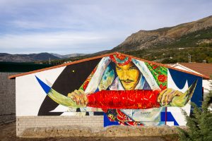 Seguimos con el coche hasta Robregordo, municipio que en la actualidad cuenta con habitantes de numerosas nacionalidades. La multiculturalidad que Eva Mena refleja en su trabajo se muestra de manera especial en este mural, donde, por un lado, ha querido presentar la migración a través de una Collalba Gris (Oenanthe Oenanthe), un ave migratoria de alta y media montaña que es una especie estival en toda Europa. El ave se posa sobre una rama de acebo, haciendo alusión al bosque de acebos de Robregordo, considerado uno de los mejor conservados de la Comunidad de Madrid. Por otro lado, la artista ha fotografiado a dos lugareñas, Celsa y Marina. Celsa mira al pasado, recoge todo el conocimiento y costumbres del lugar, mientras que Marina mira al futuro, sumando bagajes.