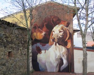 Nos dirigimos para terminar el recorrido al municipio de Canencia, en esta ocasión, Furyo hace un guiño a la toponimia de Canencia. Algunos historiadores citan que Canencia probablemente provenga de canes -perros en latín-, y es que según cuenta la historia el término municipal fue probablemente utilizado como coto de caza de la Corona de Castilla. Por ello, en la pintura mural el artista representa varios perros de caza con un estilo figurativo propio de su investigación y estilo artístico.