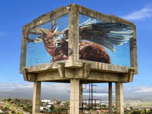 Seguidamente llegaremos a Cotos de Monterrey ubicado en la localidad de Venturada. En esta pintura el artista recrea unas “criaturas mitológicas” que viven en lo alto del depósito de Cotos de Monterrey: los “guardianes de la comarca”. Inspiradas en la historia de la fauna de la Sierra Norte de Madrid y del Parque Nacional Sierra de Guadarrama, observamos, por un lado y mirando al pasado un pegaso con cuerpo de gamo y alas de rabilargo. Por el otro lado, observamos un corzo con alas de milano real.