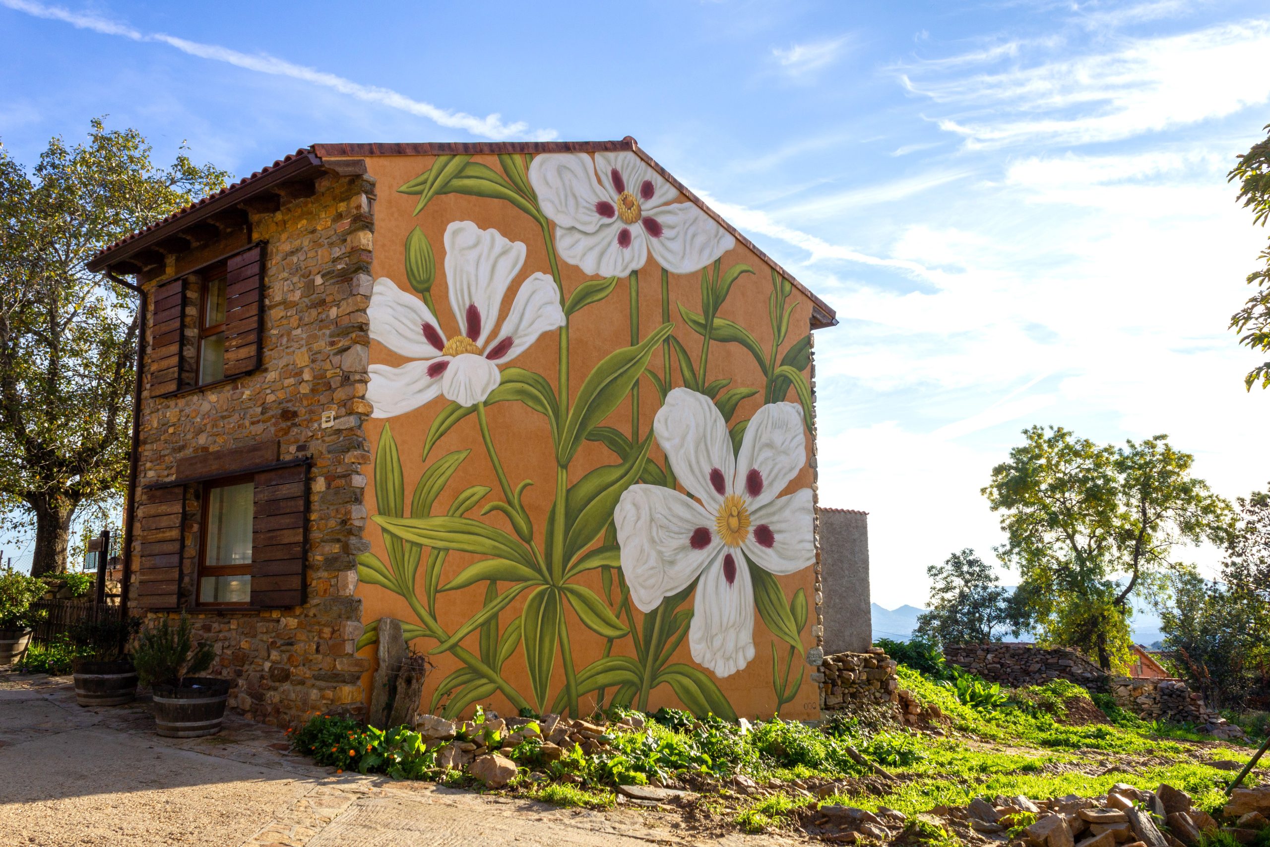 La pintura mural realizada por Doa Oa en Berzosa de Lozoya se titula “Reforestando Cistus Ladanifer”. Se trata una pintura en la que la artista se inspira en la vegetación que crece silvestre en la zona. Doa Oa pone el foco en la importancia del conocimiento de la botánica y también en mostrar la belleza de las especies silvestres. La jara pringosa crece en toda la sierra en la que se encuentra esta localidad y forma, por tanto, parte esencial del paisaje de Berzosa de Lozoya, donde siempre está presente el verde de sus hojas, así como sus características flores blancas y el peculiar aroma que desprende en primavera.