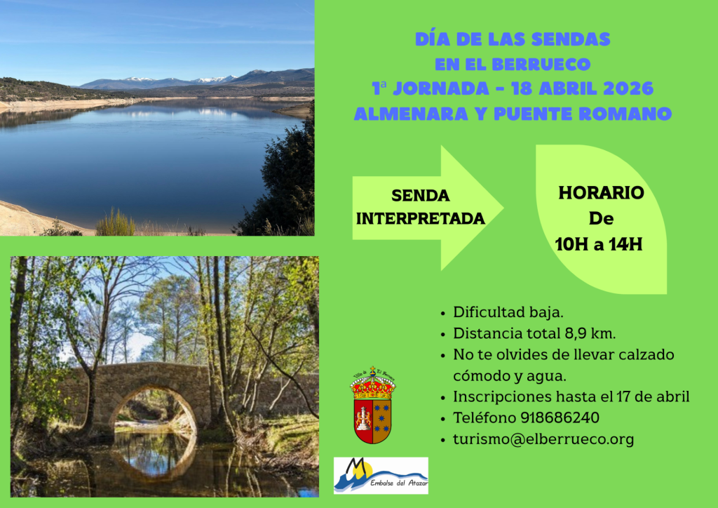 sábado 18 de abril 2026 1ª jornada- Almenara y Puente Romano Horario: 10:00-14:00 · Dificultad baja. · Distancia total 8,9 km. · No te olvides de llevar calzado cómodo y agua. · Inscripciones hasta el 17 de abril · Teléfono 918686240 turismo@elberrueco.org