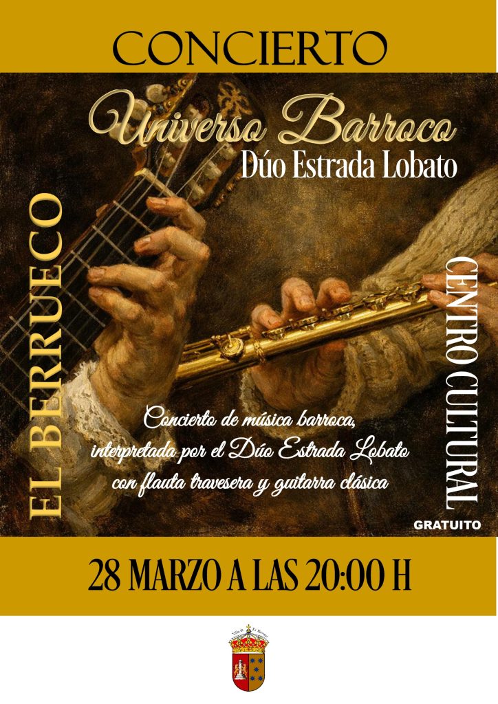 sábado 28 de marzo 2026 Hora: 20:00 Lugar: Centro Cultural de El Berrueco Entrada: Gratuita Concierto de música barroca, interpretada por el Dúo Estrada Lobato con flauta travesera y guitarra clásica.