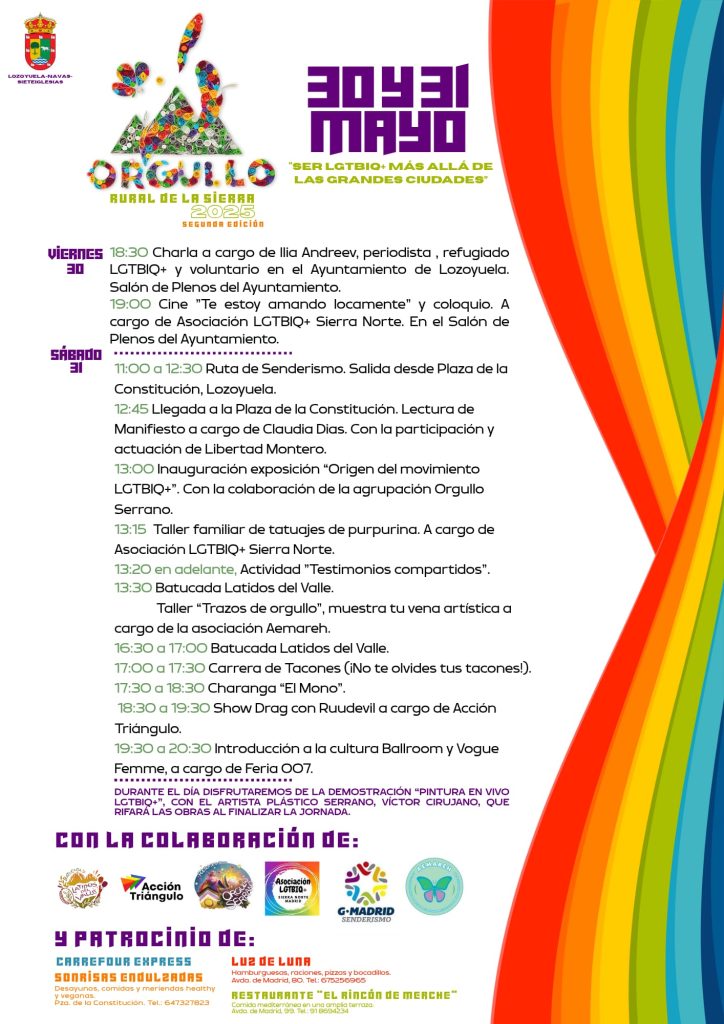Los días 30 y 31 de mayo, Lozoyuela acoge una nueva edición del Orgullo Rural de la Sierra, una celebración diversa, participativa y reivindicativa que pone en valor la visibilidad del colectivo LGTBIQ+ en el entorno rural.
