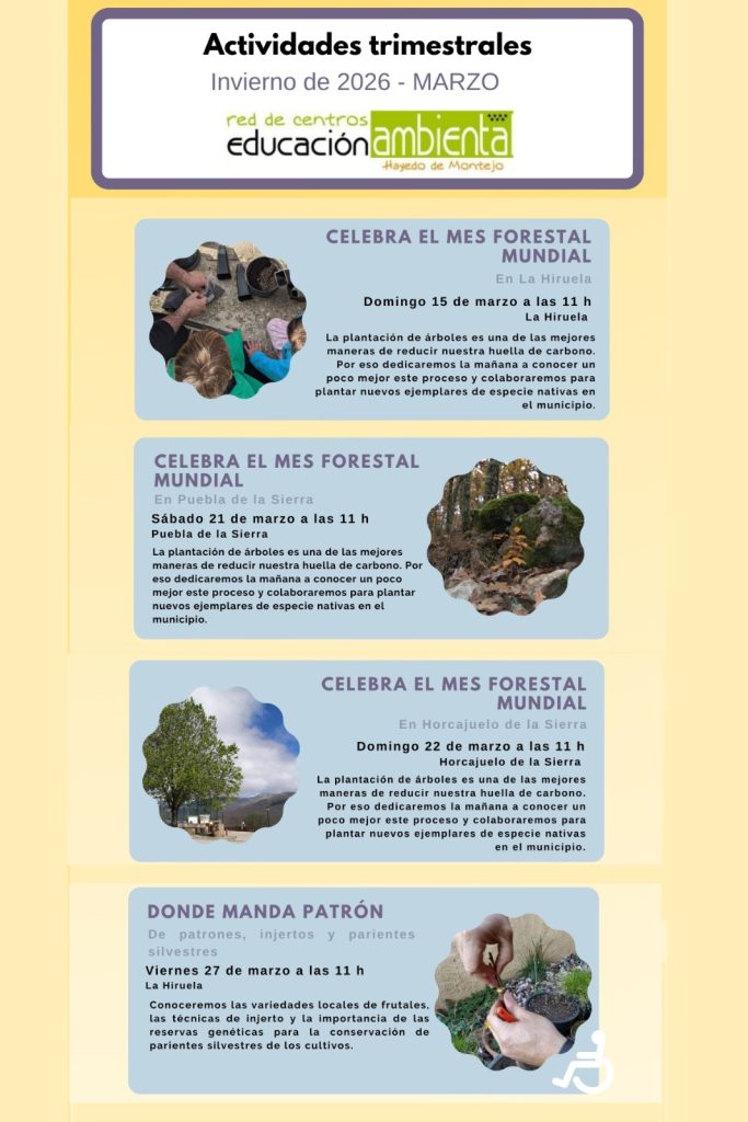 sábado 21 de marzo 2026 Puebla de la Sierra 11:00 – 14:00 h CELEBRA EL MES FORESTAL MUNDIAL En Puebla de la Sierra PREVIA INSCRIPCIÓN llamando al 91 869 70 58 o en el Centro de Información de la Reserva de la Biosfera de la Sierra del Rincón, calle Real 64 Montejo de la Sierra, […]
