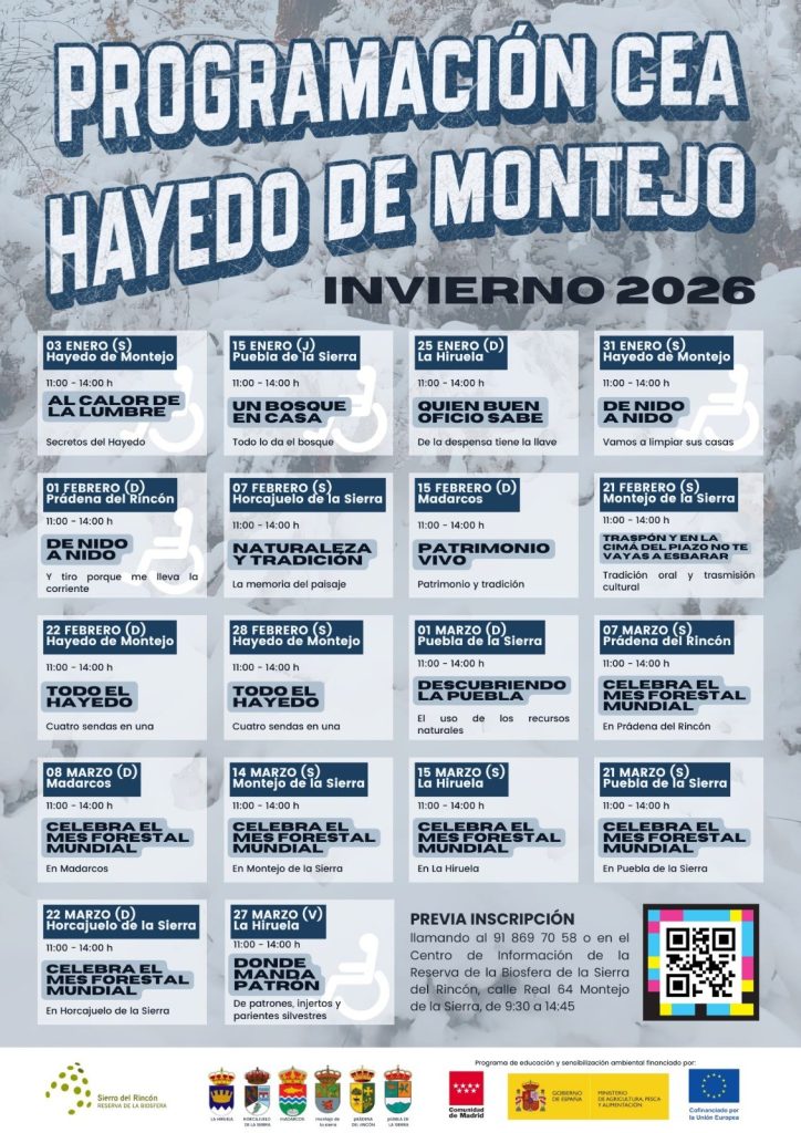 jueves 15 de enero 2026 Puebla de la Sierra Hora: 11:00 – 14:00 h UN BOSQUE EN CASA Todo lo da el bosque PREVIA INSCRIPCIÓN llamando al 91 869 70 58 o en el Centro de Información de la Reserva de la Biosfera de la Sierra del Rincón, calle Real 64 Montejo de la […]