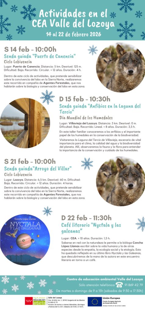 domingo 15 de febrero 2026 Hora: 10:30 Lugar: Villavieja del Lozoya Distancia: 3 km. Desnivel: 0 m. Dificultad: Baja. Recorrido: Lineal Edad: + 8 años. Duración: 3.5 h. En este taller familiar conoceremos a los anfibios y el importante papel de los humedales en la conservación de la biodiversidad. Visitaremos la Laguna del Tercio de […]